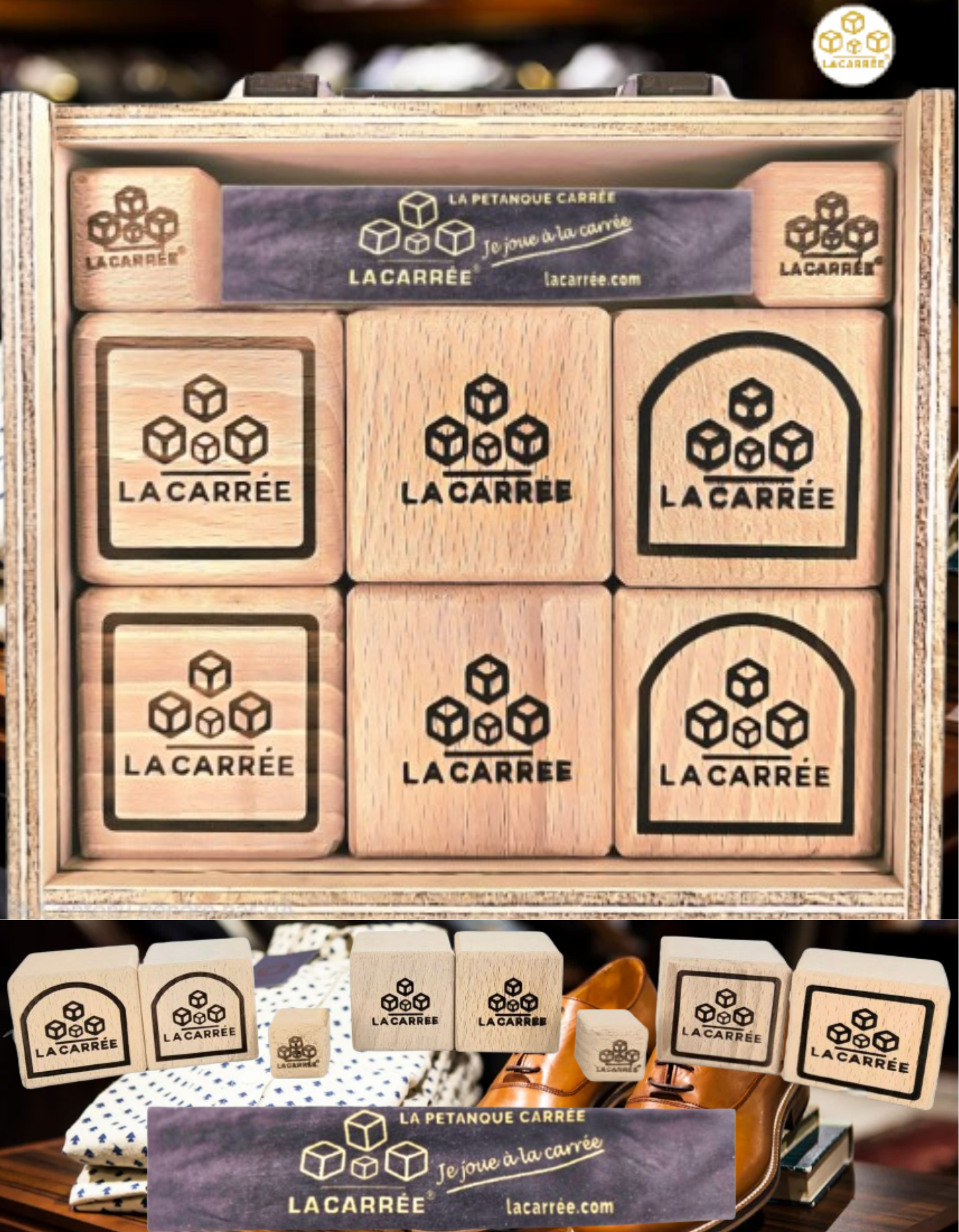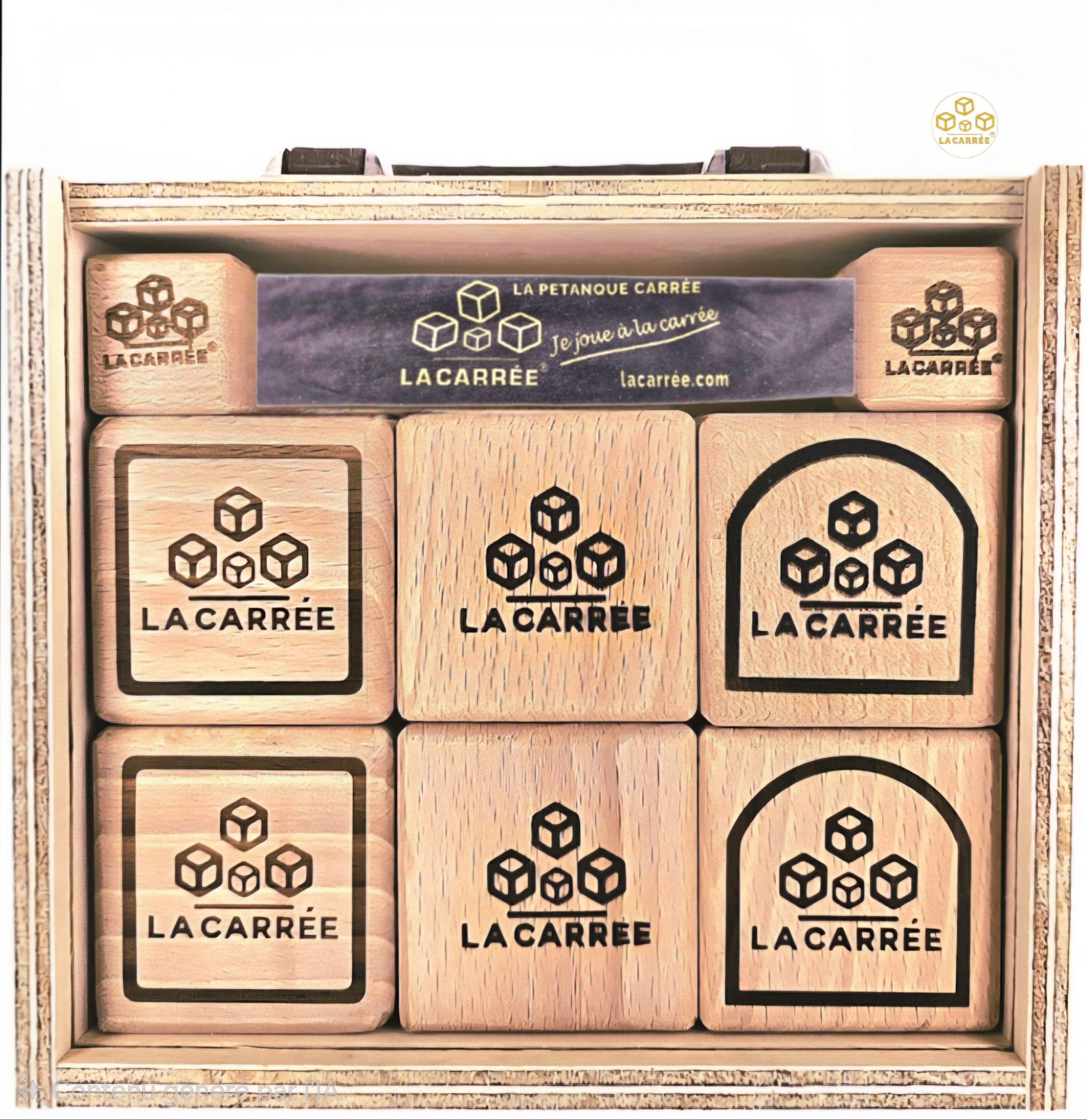 La pétanque carrée LACARRÉE : La règle du jeu imprimée au dos en Français et en Anglais avec la petite histoire :Carrée LACARRÉE carrée carrée LACARRÉE Dômes LACARRÉE :6 cubes en bois 68 mm avec 2 logos2 cubes : 2 faces logos carrée LACARRÉE2 cubes : 2 faces logos Carrées Carrées LACARRÉE2 cubes : 2 faces logos Dômes LACARRÉE2 titchons (cochonnets) 35 mm1 chiffonnette microfibreMade in FranceCréer et Fabriquer en FRANCE par la marque LACARRÉE